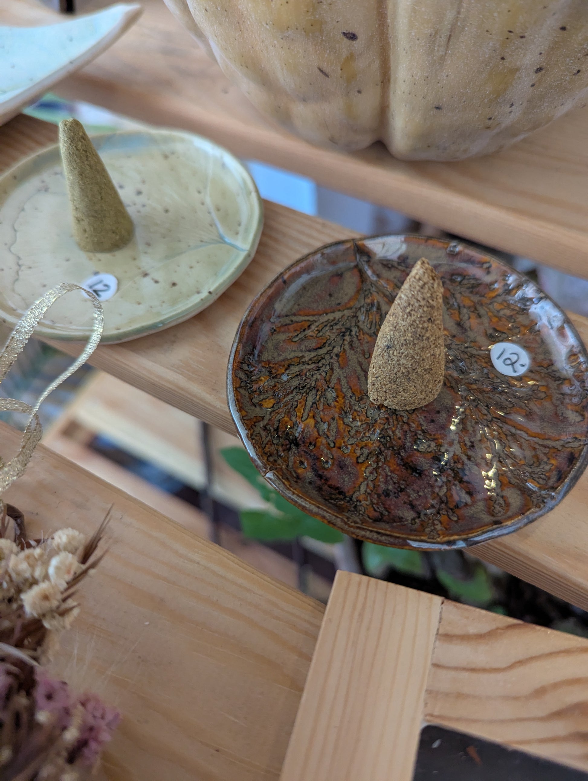 Conçues spécialement pour accueillir tes cônes d’encens, elles protègent tes surfaces tout en ajoutant une touche d’élégance naturelle à tes rituels. Leur format discret et polyvalent leur permet aussi de servir de repose-bijoux, de coupelle à offrandes ou de petite assiette décorative.