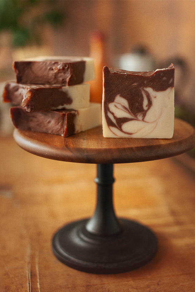 Ingrédients: ***huile de tournesol bio, **huile de coco bio, *Huile de Colza, eau, hydroxyde de sodium, beurre de cacao, chocolat noir, acide stéarique végétale, lactate de sodium, cire de candelilla, sucre, synergie d'huiles essentielles.
